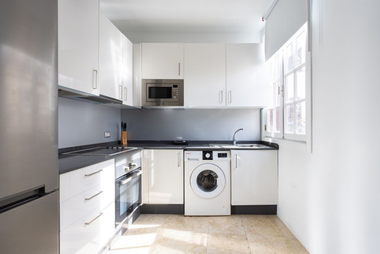 El apartamento cuenta con dos dormitorios dobles: uno principal con una cómoda cama de matrimonio para un descanso plácido después de un día de aventuras, y otro con dos camas individuales, perfecto para los niños o amigos que te acompañen. El baño está equipado con una ducha para que puedas relajarte y desconectar. La cocina, abierta al salón-comedor, te invita a preparar y disfrutar de comidas caseras; está totalmente equipada con todo lo que necesitas, desde un horno hasta una cafetera, asegurando que tu experiencia culinaria sea siempre agradable.